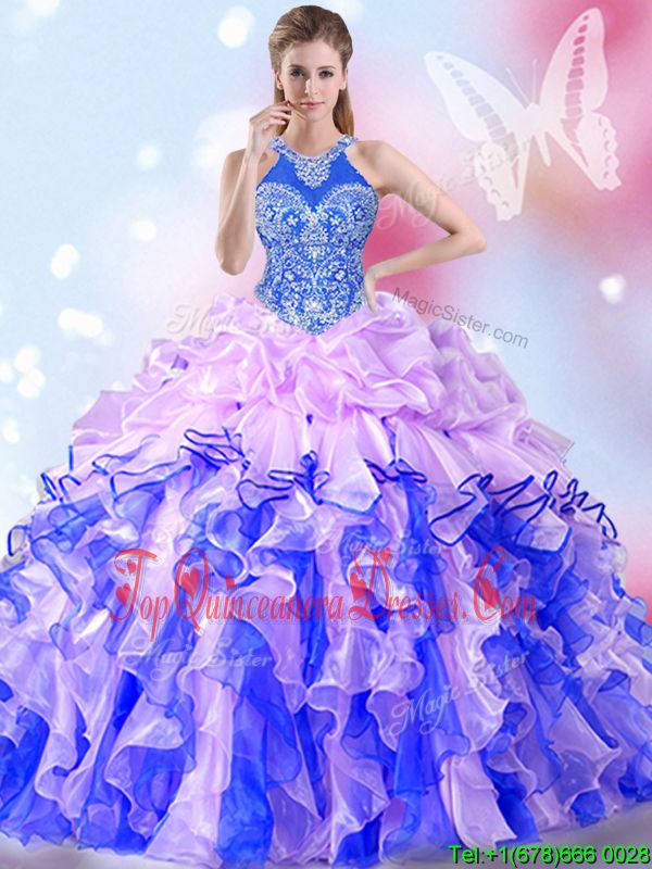 Amazing Multi-color Quinceanera Dresses Military Ball and Sweet 16 and Quinceanera and For with Beading and Ruffles and Pick Ups Halter Top Sleeveless Lace Up