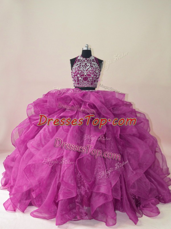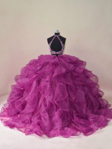 Amazing Organza Scoop Sleeveless Brush Train Backless Beading and Ruffles Vestidos de Quinceanera in Fuchsia