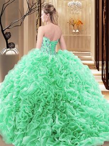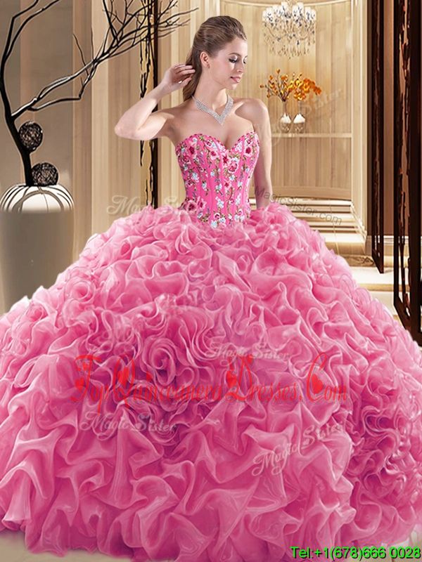 Amazing Rose Pink Ball Gowns Embroidery and Ruffles and Pick Ups Sweet 16 Quinceanera Dress Lace Up Fabric With Rolling Flowers Sleeveless Floor Length
