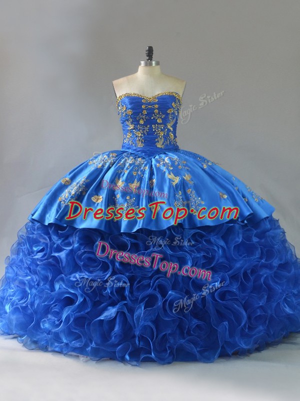 Amazing Sweetheart Sleeveless 15 Quinceanera Dress Embroidery and Ruffles Royal Blue Fabric With Rolling Flowers