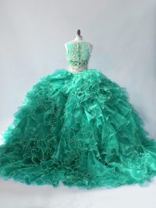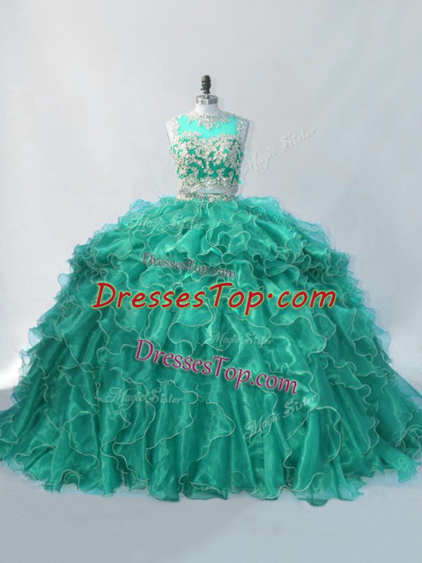 Amazing Turquoise Two Pieces Beading and Ruffles Vestidos de Quinceanera Zipper Organza Sleeveless