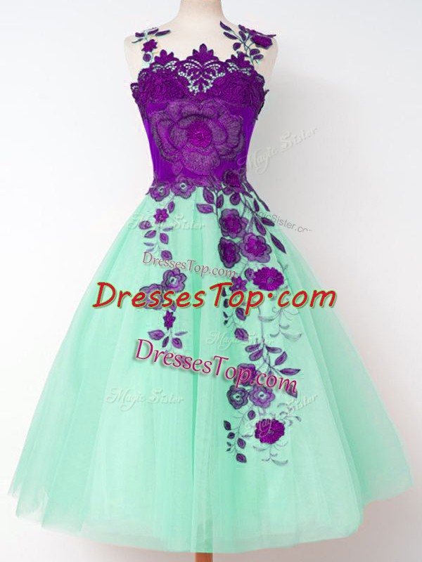 Apple Green A-line Straps Sleeveless Tulle Knee Length Lace Up Appliques Quinceanera Court of Honor Dress