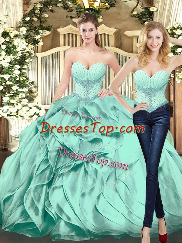 Apple Green Ball Gowns Organza Sweetheart Sleeveless Beading and Ruffles Floor Length Lace Up Quince Ball Gowns