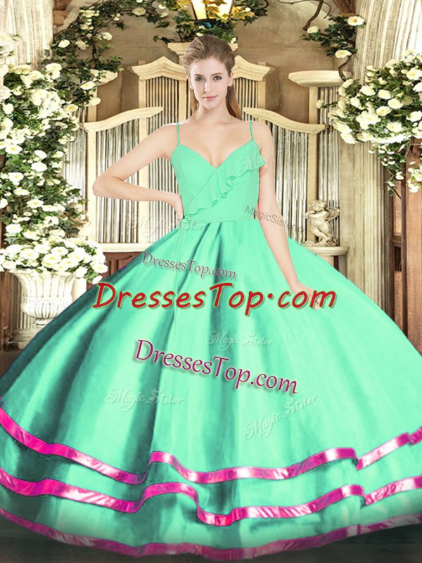 Apple Green Ball Gowns Spaghetti Straps Sleeveless Organza Floor Length Zipper Ruffled Layers Vestidos de Quinceanera