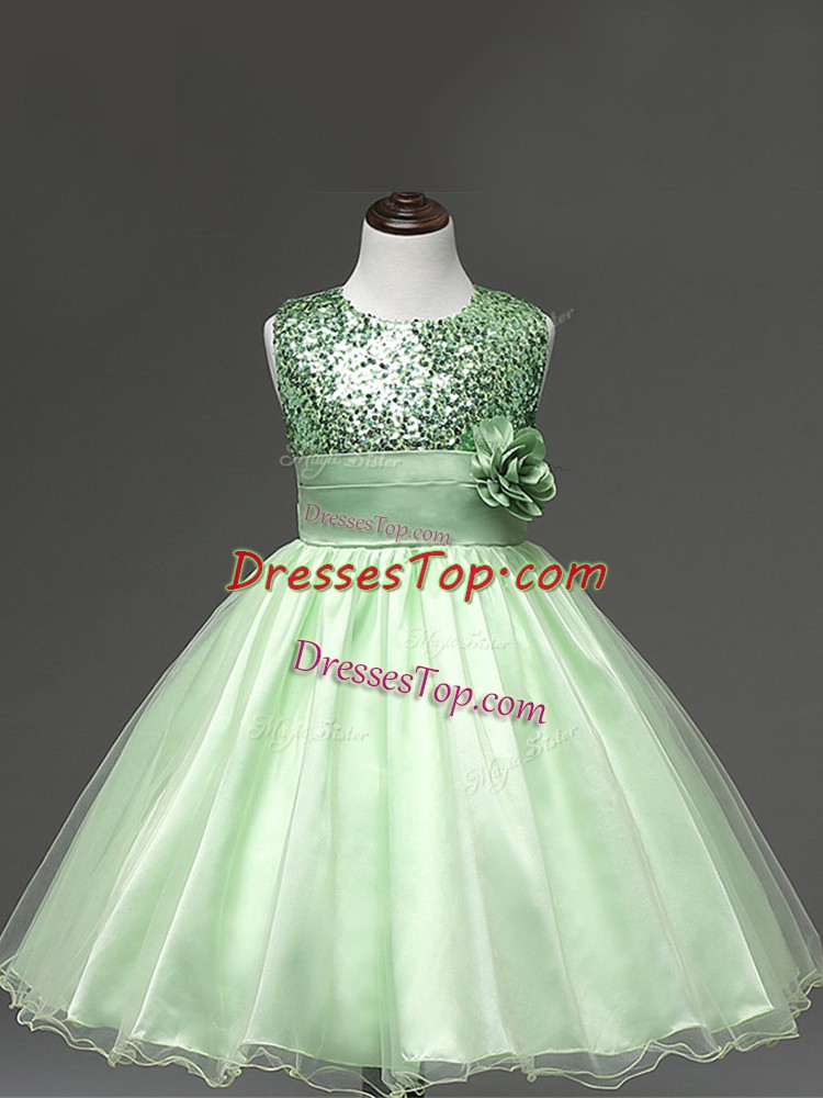 Apple Green Ball Gowns Tulle Scoop Sleeveless Sequins and Hand Made Flower Knee Length Zipper Pageant Gowns For Girls