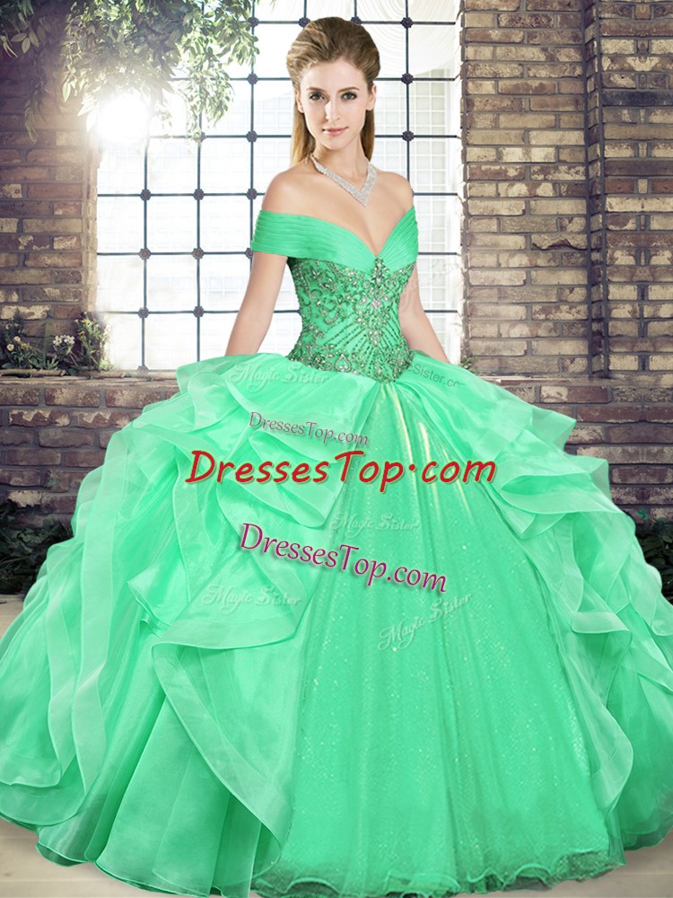 Apple Green Lace Up Vestidos de Quinceanera Beading and Ruffles Sleeveless Floor Length
