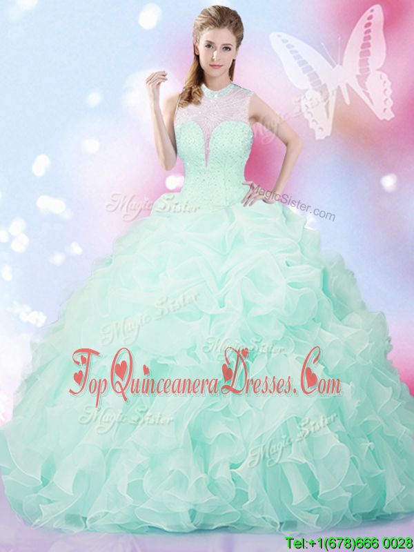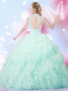 Apple Green Organza Lace Up High-neck Sleeveless Floor Length Sweet 16 Quinceanera Dress Beading and Ruffles and Pick Ups