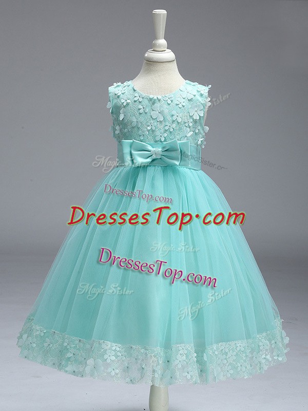Apple Green Scoop Neckline Lace and Bowknot Little Girl Pageant Dress Sleeveless Zipper