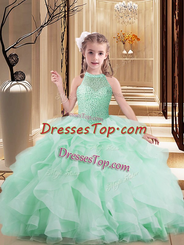 Apple Green Tulle Lace Up Custom Made Pageant Dress Sleeveless Floor Length Beading and Ruffles