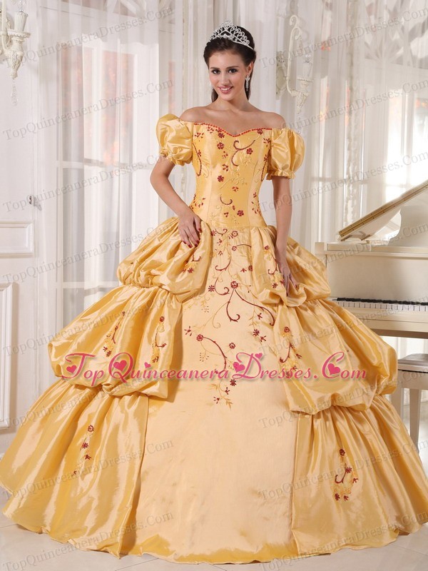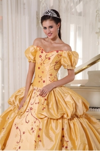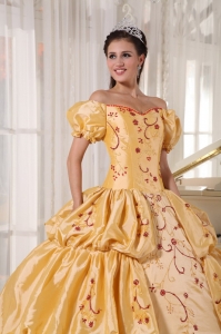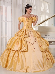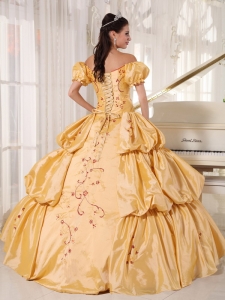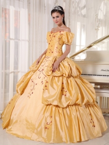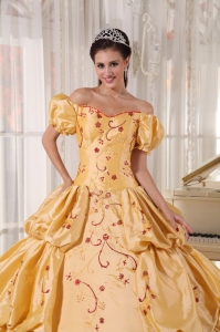 Applique And Pleated Gold Off The Shoulder Quinceanera Dress