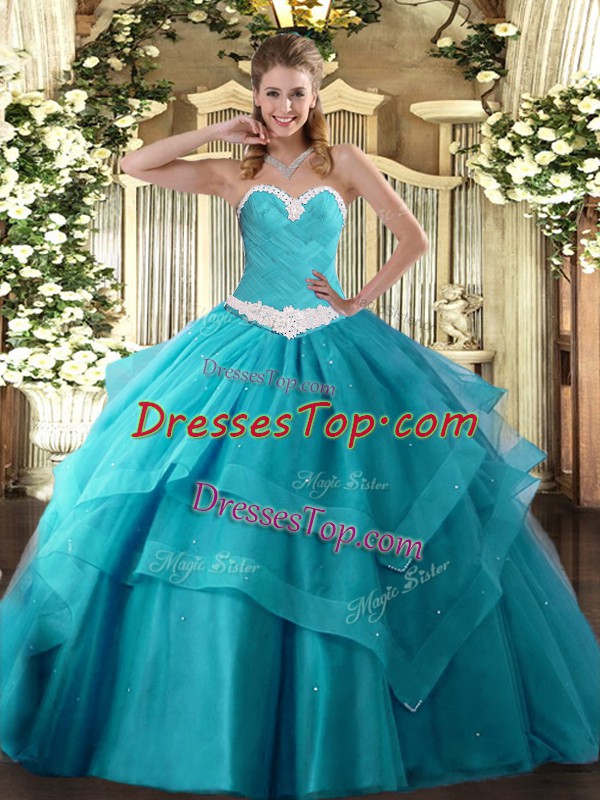 Appliques and Ruffled Layers Sweet 16 Quinceanera Dress Teal Lace Up Sleeveless Floor Length