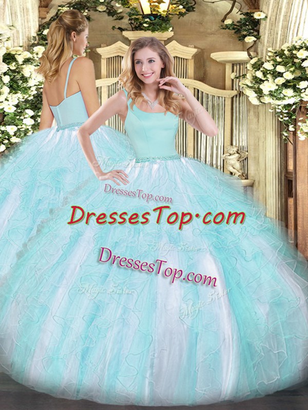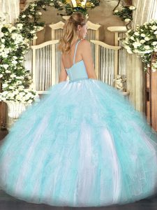 Aqua Blue Ball Gowns Beading and Ruffles Sweet 16 Dresses Zipper Tulle Sleeveless Floor Length