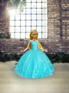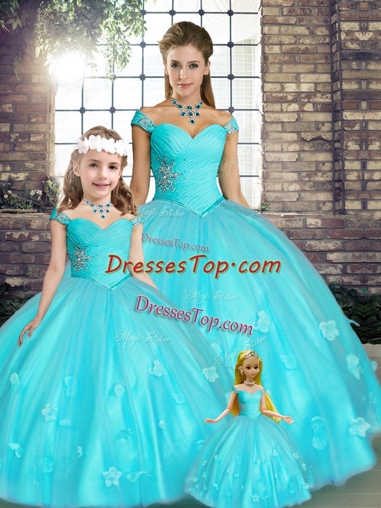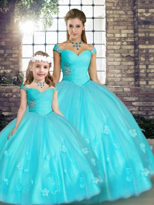 Aqua Blue Ball Gowns Off The Shoulder Sleeveless Tulle Floor Length Lace Up Beading and Appliques Sweet 16 Quinceanera Dress