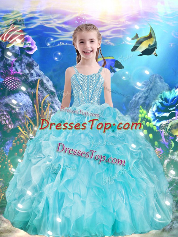 Aqua Blue Ball Gowns Organza Straps Sleeveless Beading and Ruffles Floor Length Lace Up Girls Pageant Dresses