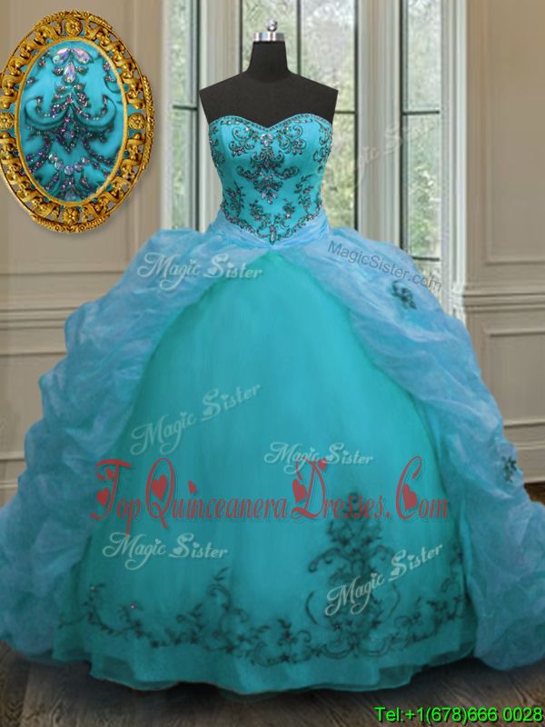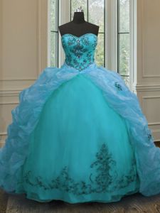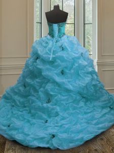 Aqua Blue Ball Gowns Organza Sweetheart Sleeveless Beading and Appliques and Pick Ups With Train Lace Up Quince Ball Gowns Court Train