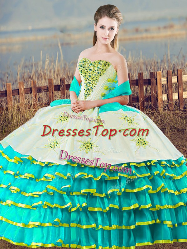 Aqua Blue Ball Gowns Organza Sweetheart Sleeveless Beading and Ruffled Layers Floor Length Lace Up Ball Gown Prom Dress