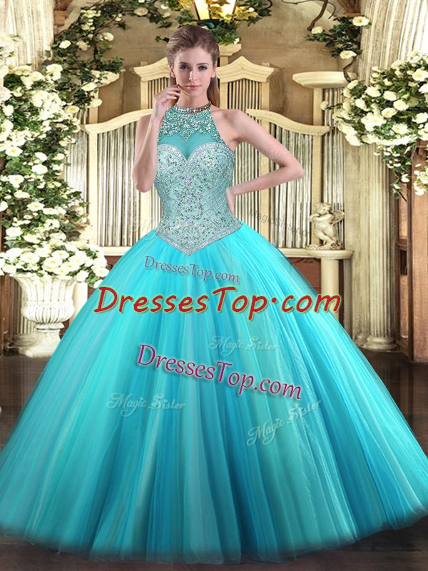 Aqua Blue Ball Gowns Tulle Halter Top Sleeveless Beading Floor Length Lace Up Quince Ball Gowns