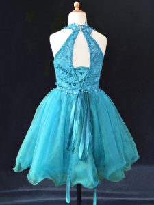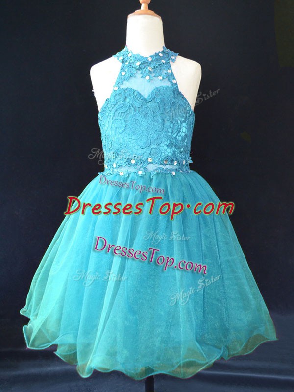 Aqua Blue Halter Top Neckline Beading and Lace Pageant Dress Toddler Sleeveless Lace Up