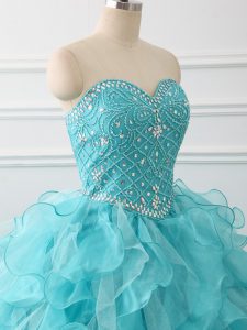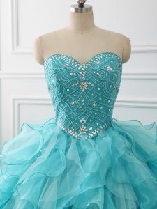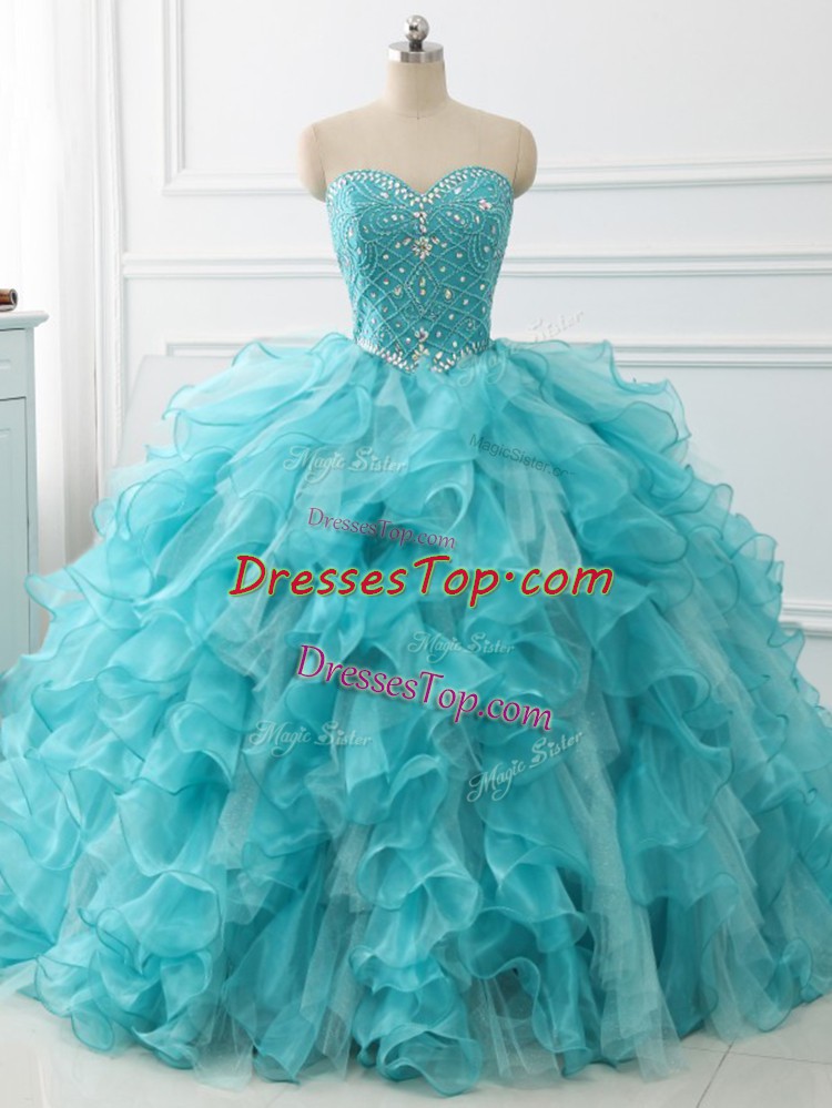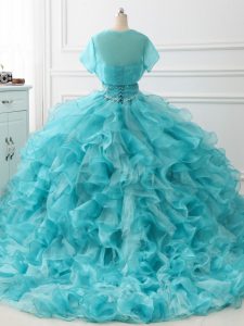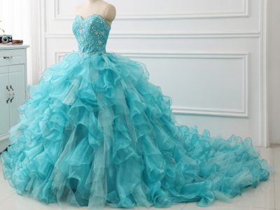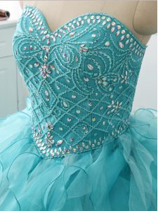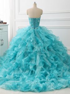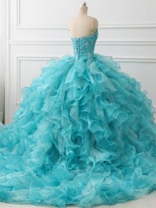 Aqua Blue Lace Up 15th Birthday Dress Beading and Ruffles Sleeveless Brush Train