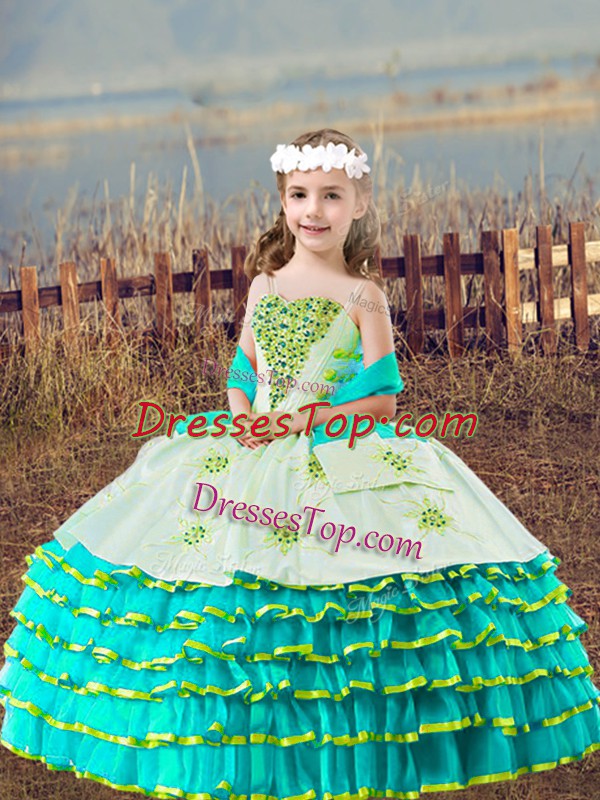 Aqua Blue Lace Up Girls Pageant Dresses Beading and Embroidery and Ruffled Layers Sleeveless Floor Length