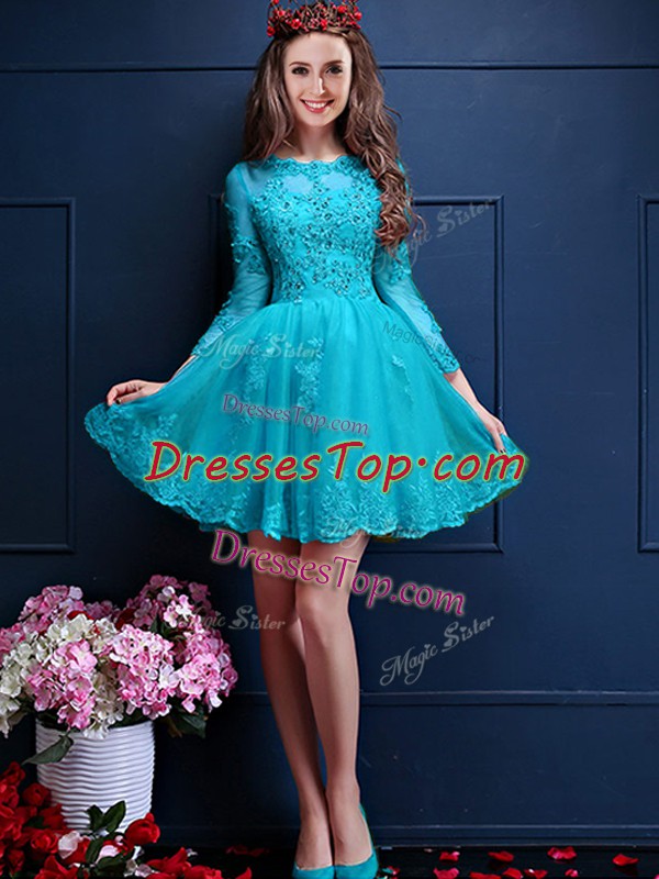 Aqua Blue Lace Up Scalloped Beading and Lace and Appliques Vestidos de Damas Chiffon 3 4 Length Sleeve