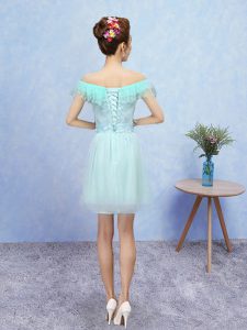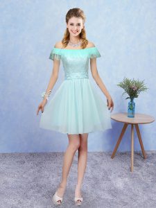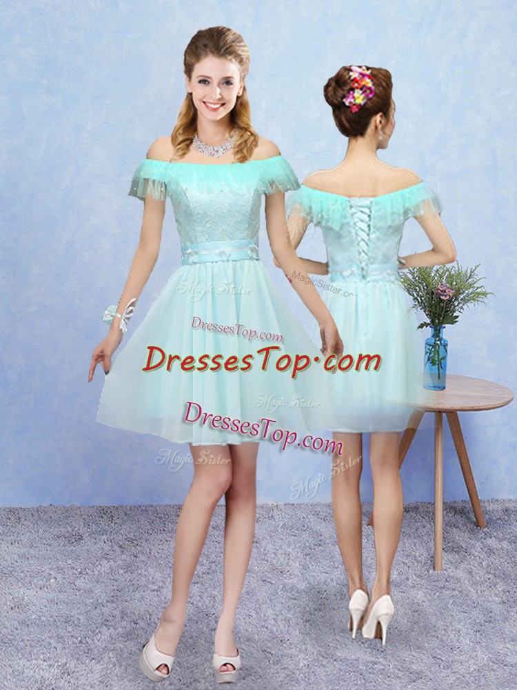 Aqua Blue Off The Shoulder Lace Up Lace Court Dresses for Sweet 16 Cap Sleeves