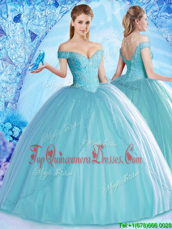Aqua Blue Off The Shoulder Neckline Beading Sweet 16 Dresses Sleeveless Lace Up