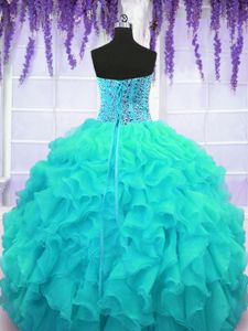 Aqua Blue Organza Lace Up 15th Birthday Dress Sleeveless Floor Length Beading and Ruffles