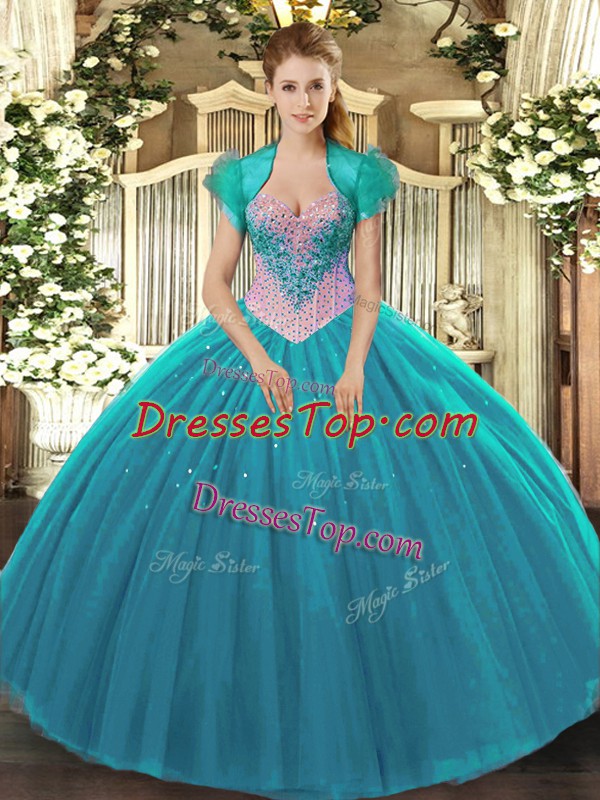 Aqua Blue Sleeveless Beading Floor Length Quinceanera Dresses