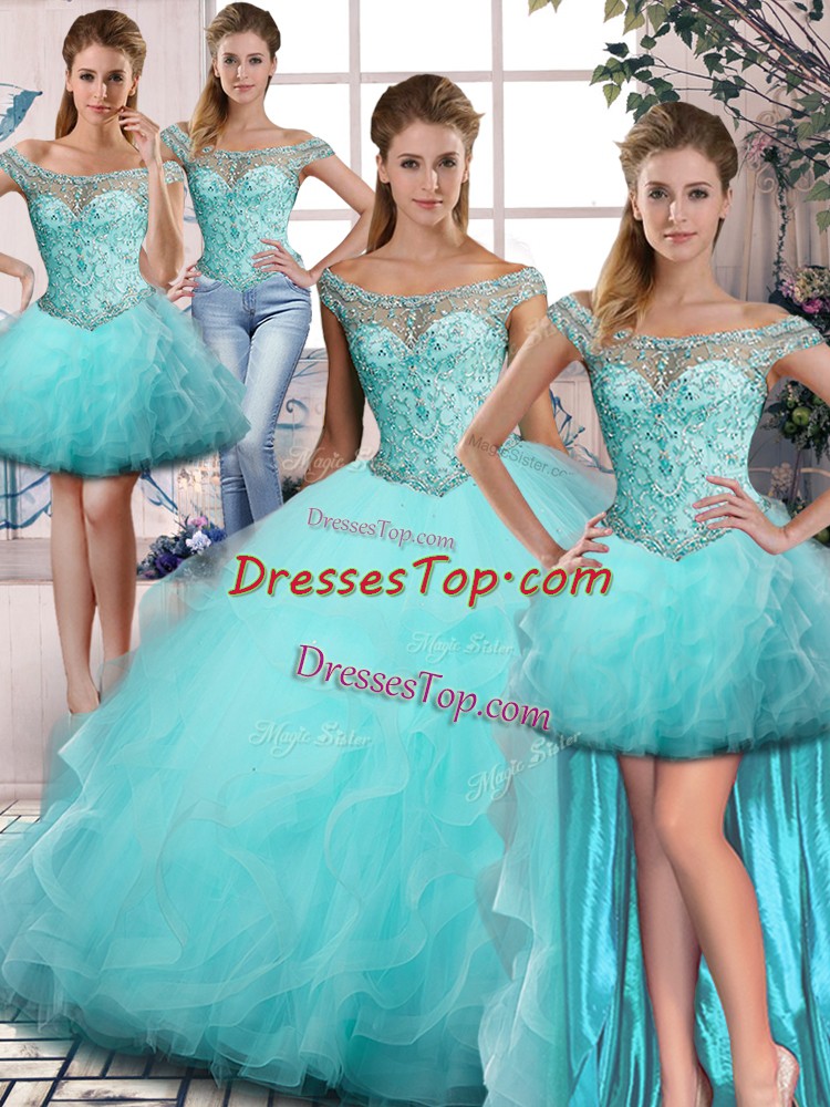 Aqua Blue Sleeveless Floor Length Beading and Ruffles Lace Up Quinceanera Gowns