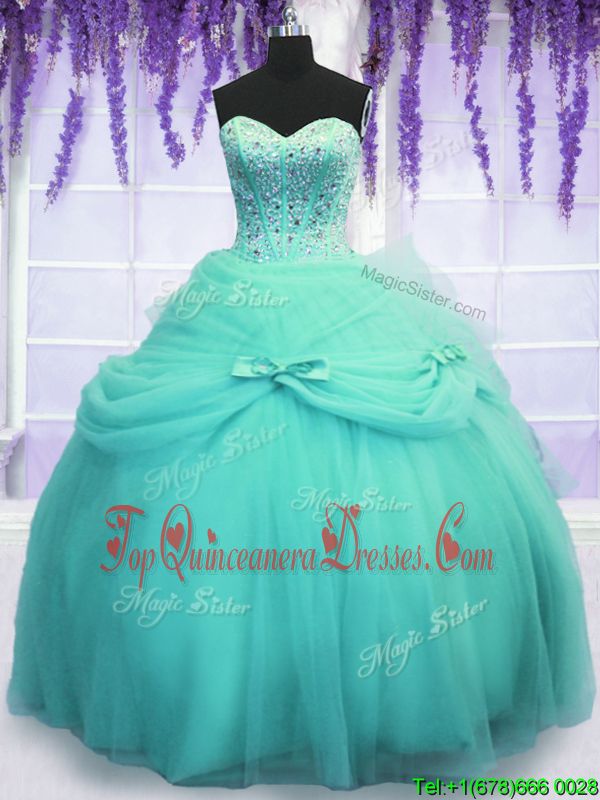 Aqua Blue Sleeveless Floor Length Beading and Sequins and Bowknot Lace Up 15 Quinceanera Dress