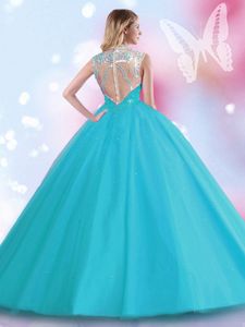 Aqua Blue Sleeveless Floor Length Beading and Sequins Zipper 15th Birthday Dress