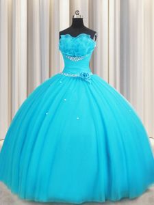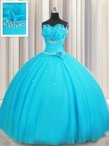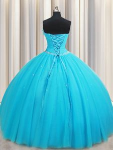 Aqua Blue Sleeveless Tulle Lace Up Ball Gown Prom Dress for Military Ball and Sweet 16 and Quinceanera