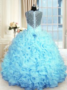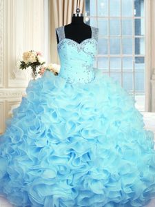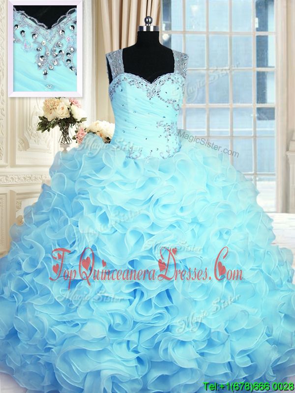 Aqua Blue Straps Zipper Beading and Ruffles Damas Dress Sleeveless
