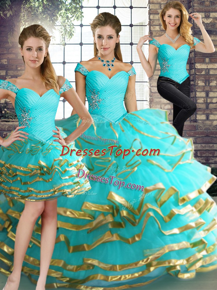 Aqua Blue Three Pieces Beading and Ruffled Layers 15th Birthday Dress Lace Up Tulle Sleeveless Floor Length