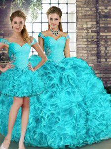 Aqua Blue Three Pieces Off The Shoulder Sleeveless Organza Floor Length Lace Up Beading and Ruffles Sweet 16 Quinceanera Dress