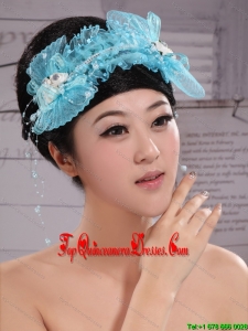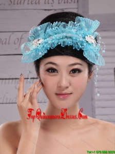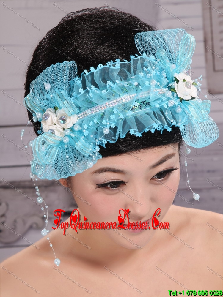 Aqua Blue Tulle Headpieces With Rhinestones and Imitation Pearls Decorate