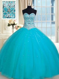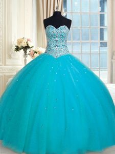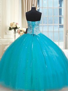 Aqua Blue Tulle Lace Up Sweet 16 Dresses Sleeveless Floor Length Beading and Sequins