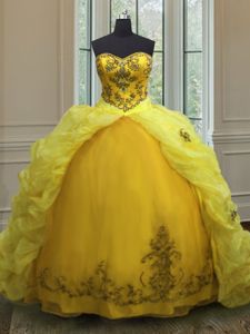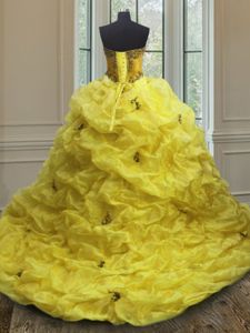 Artistic Beading and Appliques and Pick Ups Quinceanera Dress Light Yellow Lace Up Sleeveless With Train Court Train