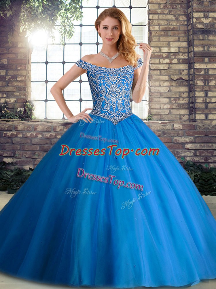 Artistic Blue Off The Shoulder Neckline Beading Sweet 16 Dress Sleeveless Lace Up