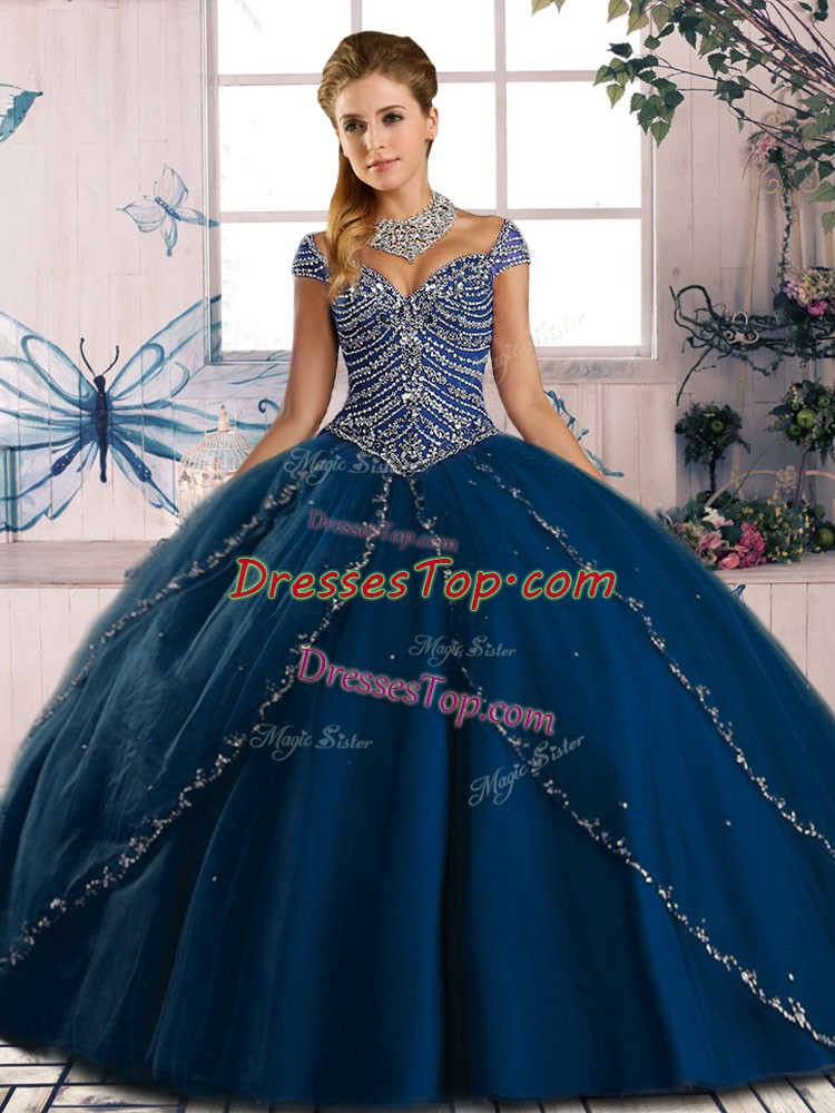 Artistic Brush Train Ball Gowns Sweet 16 Quinceanera Dress Blue Sweetheart Tulle Cap Sleeves Lace Up