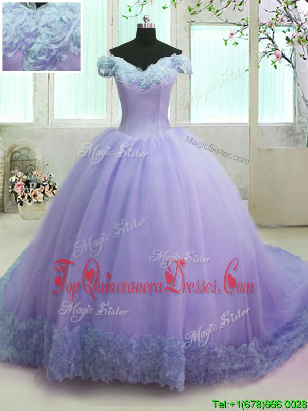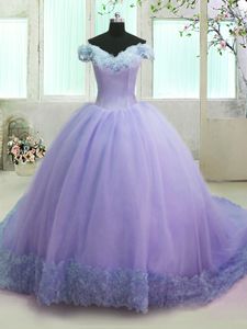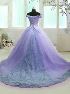 Artistic Court Train Ball Gowns Sweet 16 Quinceanera Dress Lavender Off The Shoulder Organza Short Sleeves With Train Lace Up