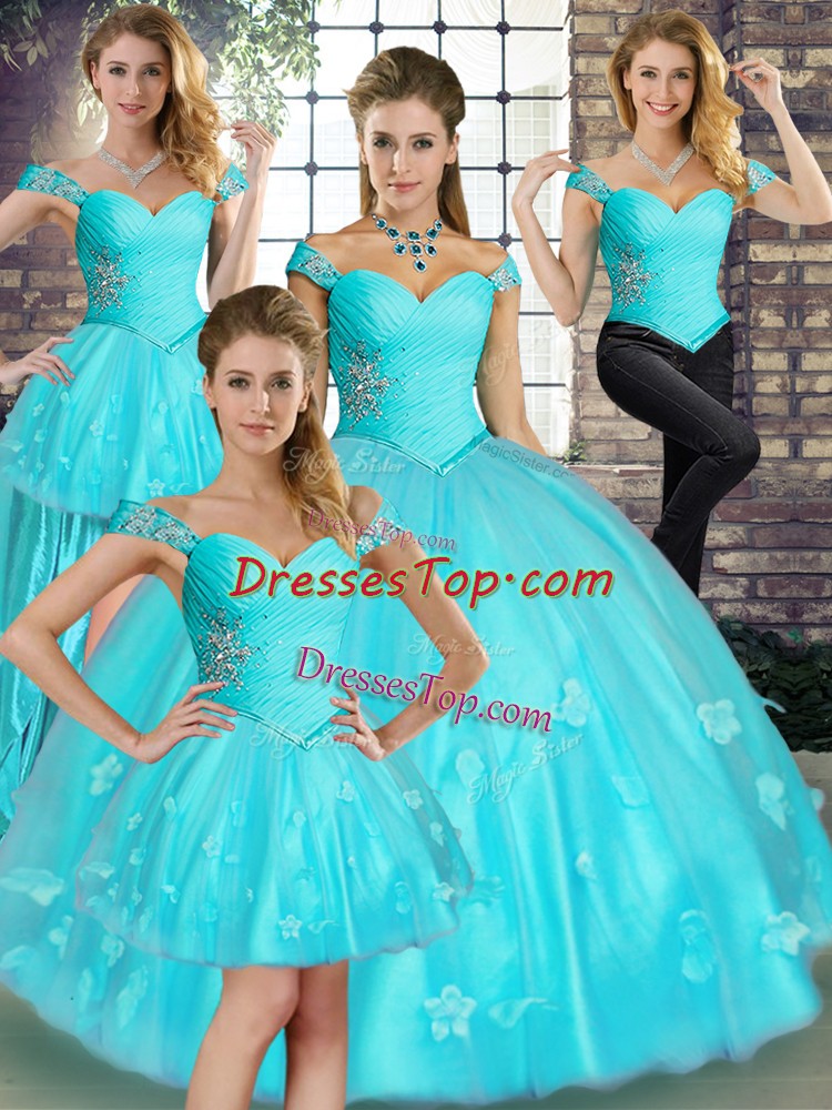 Artistic Floor Length Aqua Blue Quince Ball Gowns Off The Shoulder Sleeveless Lace Up
