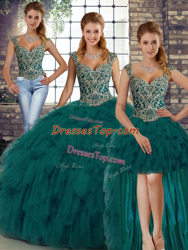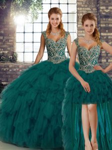 Artistic Floor Length Peacock Green Quinceanera Gowns Straps Sleeveless Lace Up