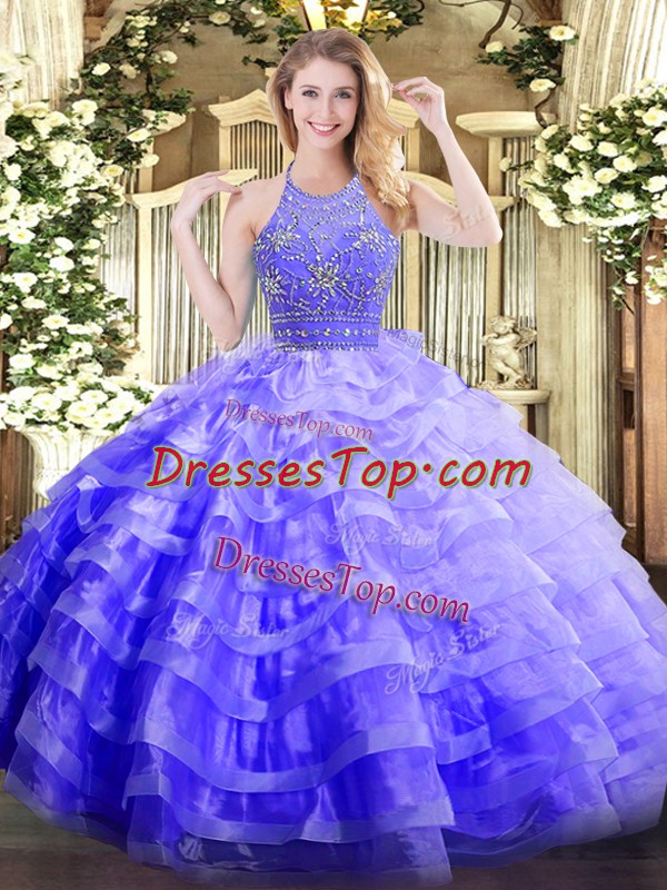 Artistic Lavender Organza Zipper Halter Top Sleeveless Floor Length 15 Quinceanera Dress Beading and Ruffled Layers