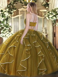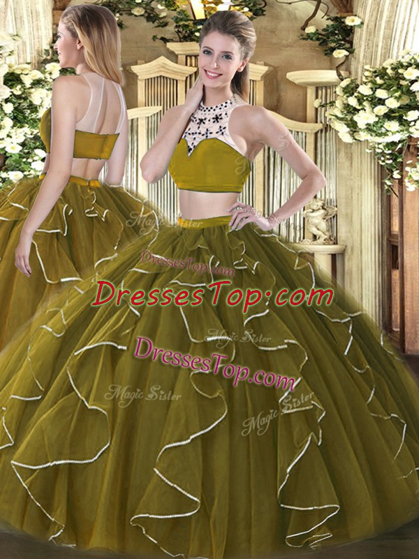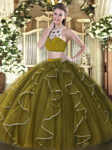 Artistic Olive Green Organza Backless High-neck Sleeveless Floor Length Quinceanera Dress Beading and Ruffles
