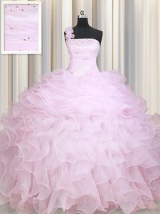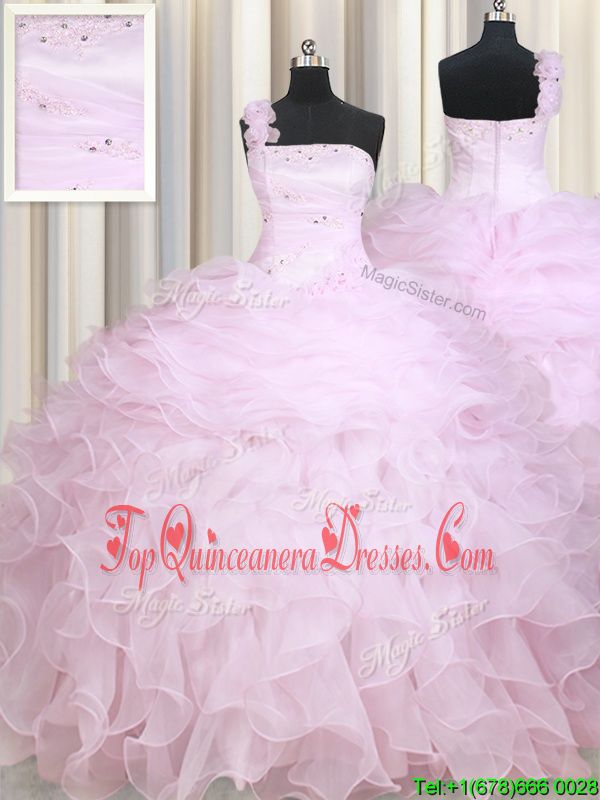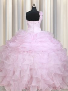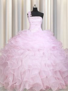 Artistic One Shoulder Sleeveless Organza Floor Length Zipper Quinceanera Dresses in Baby Pink for with Beading and Ruffles