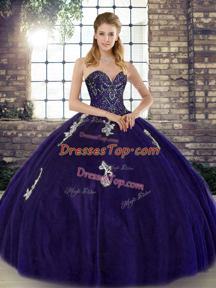 Artistic Sleeveless Floor Length Beading and Appliques Lace Up Vestidos de Quinceanera with Purple