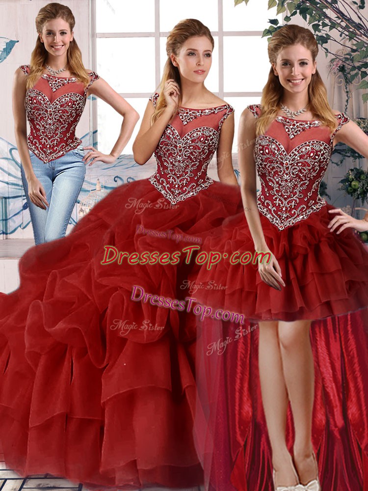 Attractive Beading and Pick Ups 15th Birthday Dress Wine Red Zipper Sleeveless Brush Train