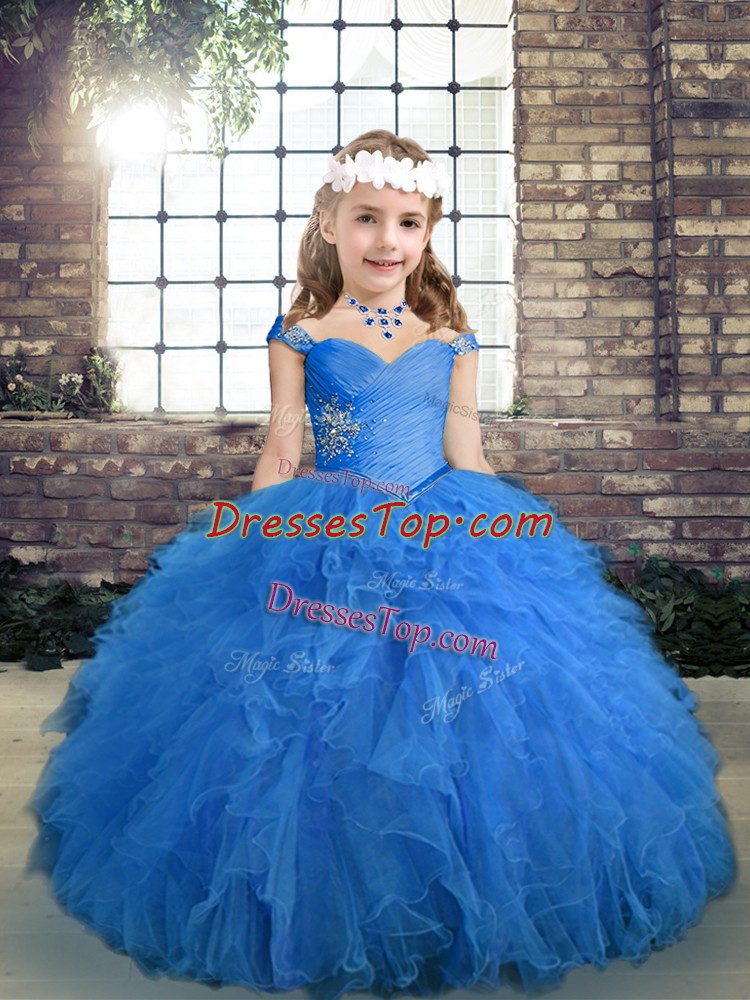 Attractive Blue Ball Gowns Tulle Straps Sleeveless Beading and Ruffles Floor Length Lace Up Pageant Dress Toddler